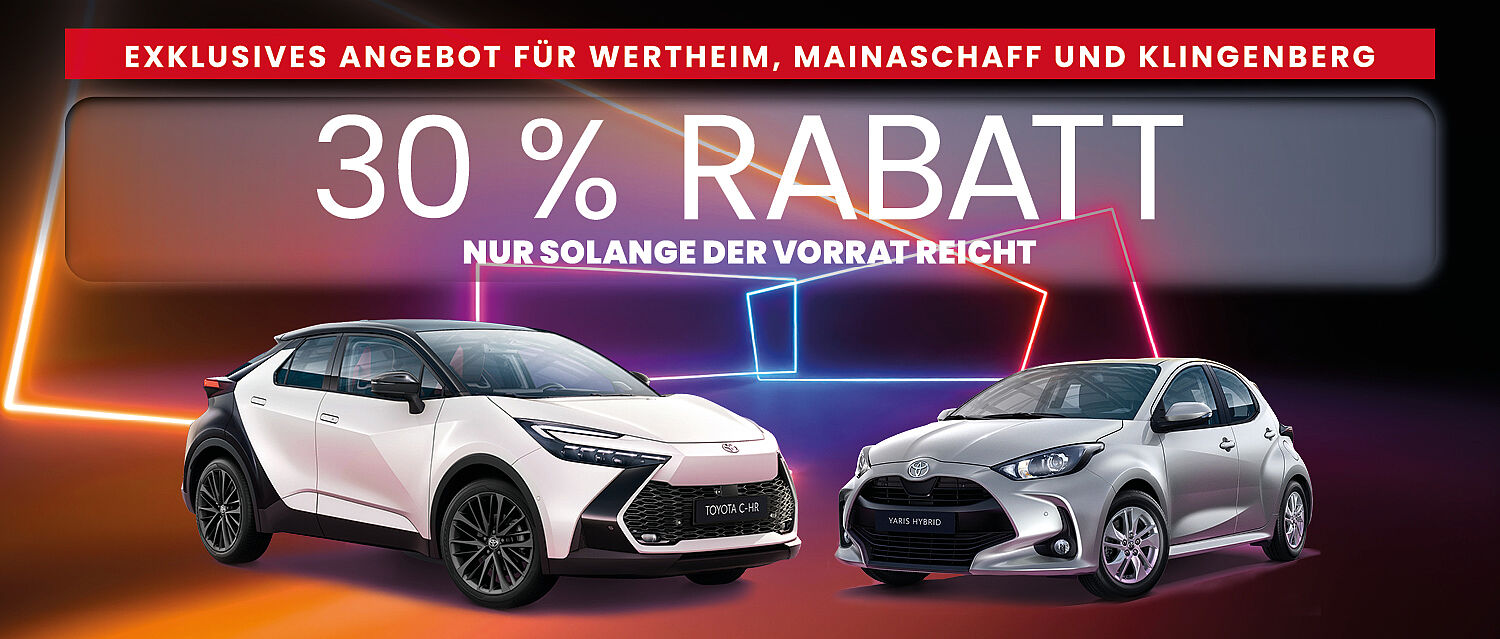 30 % Rabatt auf Toyota Yaris & Toyota C-HR Tageszulassungen 🔥Kurzfristig verfügbare Fahrzeuge – nur solange der Vorrat reicht.